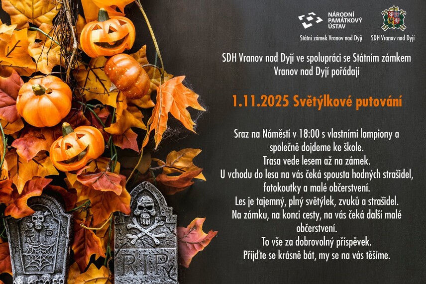 Sbor dobrovolných hasičů Vranov nad Dyjí ve spolupráci se státním zámkem Vranov nad Dyjí vás srdečně zve na Světýlkové putování, které se uskuteční v sobotu 1. listopadu 2025.